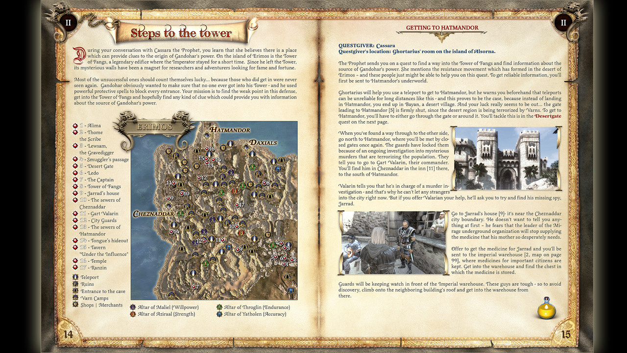 • Beschreibung aller Haupt- und Nebenquests mit alternativen Lösungswegen, sowie Angaben zu den Standorten und Abbildungen zu den Questgebern.