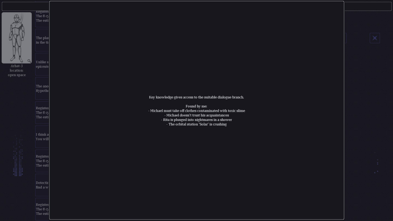 This is text adventure game of survival of the astronauts on the orbital station that is lost in time. You will have to take care of the rescue of the station's crew. You will be the key participant in this small team, and lots of complicated riddles and situations will make this adventure even more interesting.